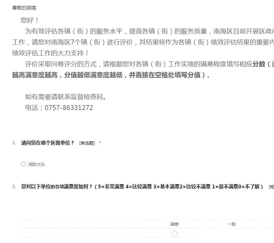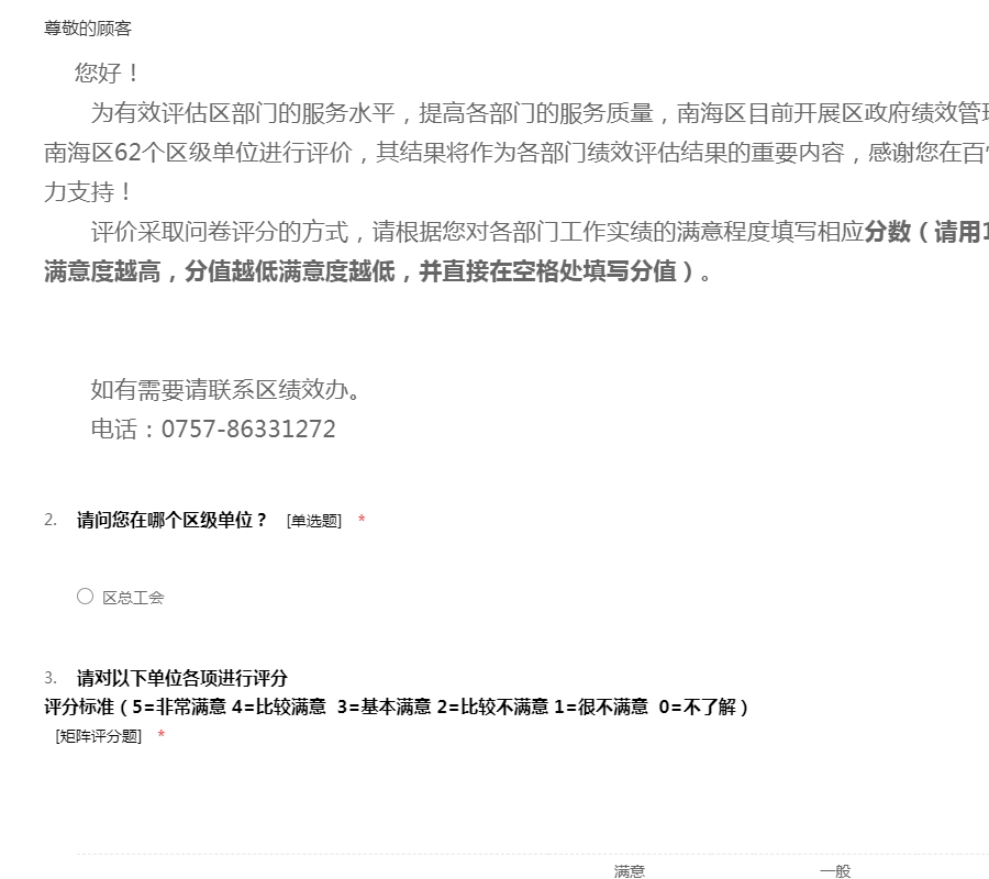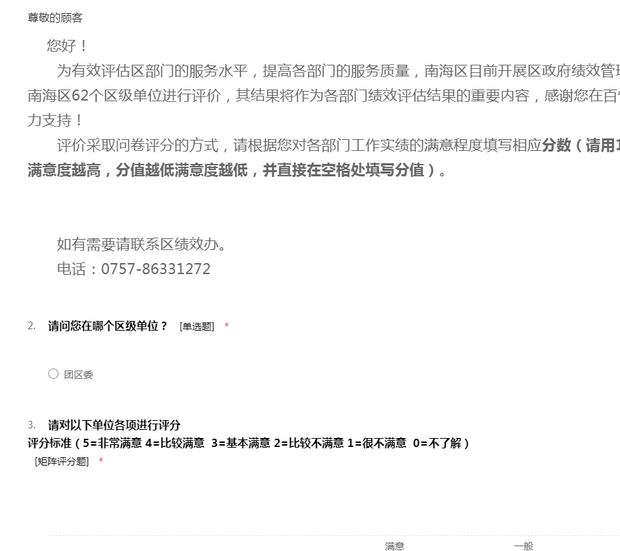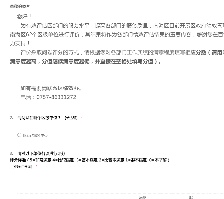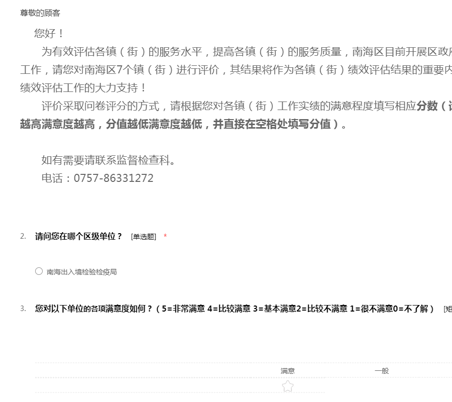 为有效评估各镇(街)的服务水平,提高各镇(街)的服务质量,南海区目前开展区政府绩效管理公众满意度调查工作,请您对南海区7个镇(街)进行评价,其结果将作为各镇(街)绩效评估结果的重要内容,感谢您在百忙中对区绩效评估工作的大力支持!