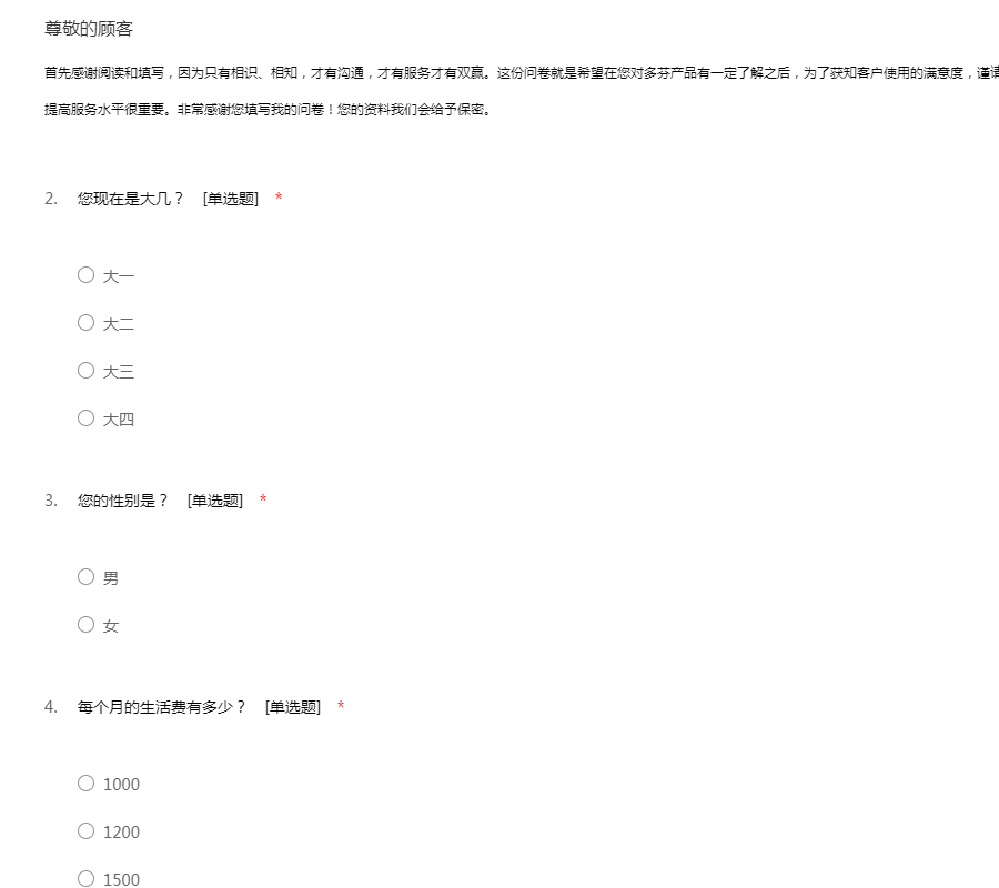 首先感谢阅读和填写,因为只有相识、相知,才有沟通,才有服务才有双赢。这份问卷就是希望在您对多芬产品有一定了解之后,为了获知客户使用的满意度,谨请您填写一下问题,您的回答对我们完成这次调查提高服务水平很重要。非常感谢您填写我的问卷!您的资料我们会给予保密。