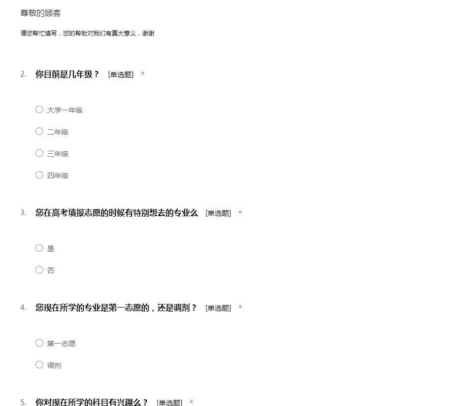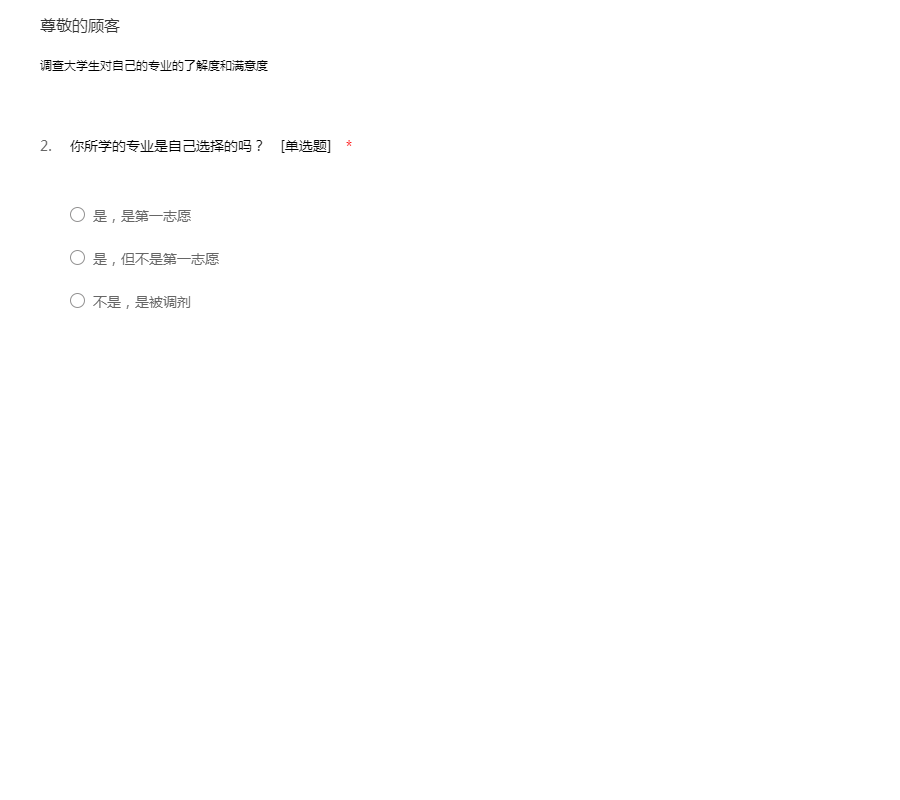 这次调查的目的,是为了了解大学生对所学专业的满意度情况。本问卷采用不计名的方式, 请在括号里写上符合你意见的最佳一项。感谢配合!