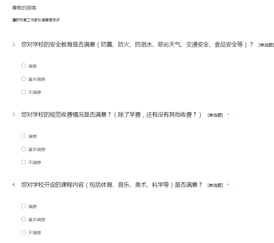 感谢您参与“家长学校满意度调查问卷”,本次调查是为了更有针对性地进行家校合作,更好的研究家庭和学校教育相结合的办法,调查所得的结果对您的工作和生活不会带来任何不良影响,请您根据自己的实际情况放心填写,51调查网感谢您的配合!