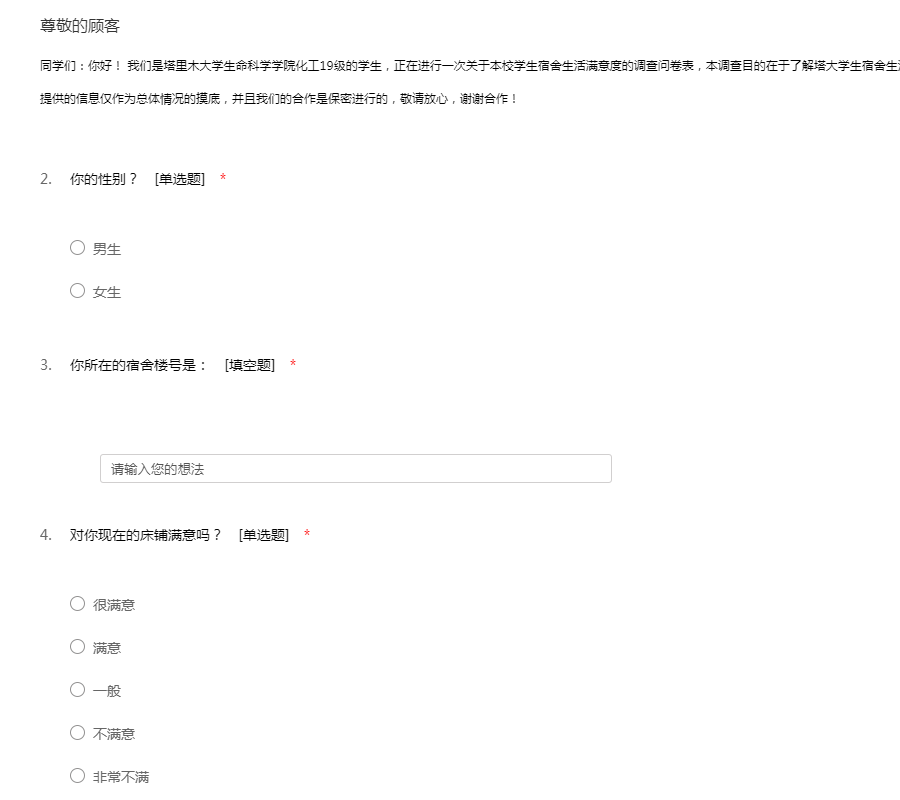 同学们:你好! 我们是塔里木大学生命科学学院化工19级的学生,正在进行一次关于本校学生宿舍生活满意度的调查问卷表,本调查目的在于了解塔大学生宿舍生活的情况,感谢你在百忙之中来回答问题,你所提供的信息仅作为总体情况的摸底,并且我们的合作是保密进行的,敬请放心,谢谢合作!