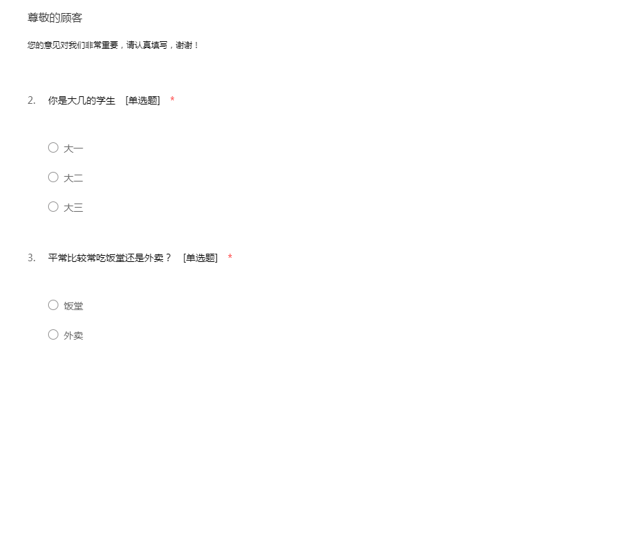 为了了解广大同学对交院餐厅的满意度,帮助提高餐厅的服务质量和水平,我们特进行此次问卷调查,对于您的参与我们十分感谢。