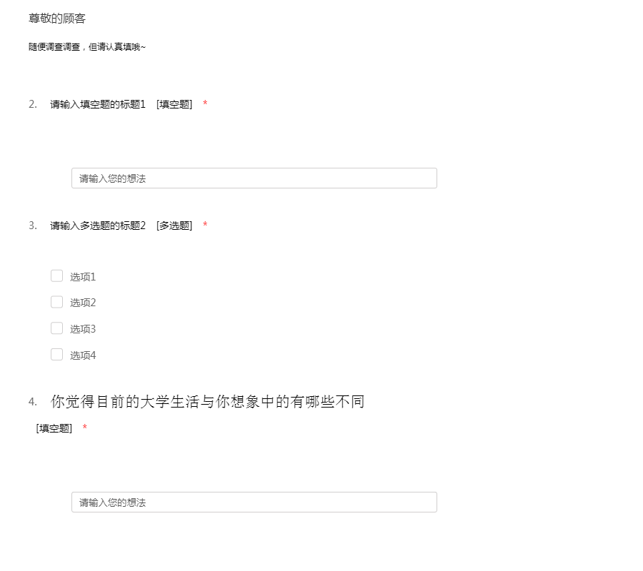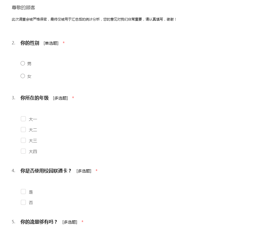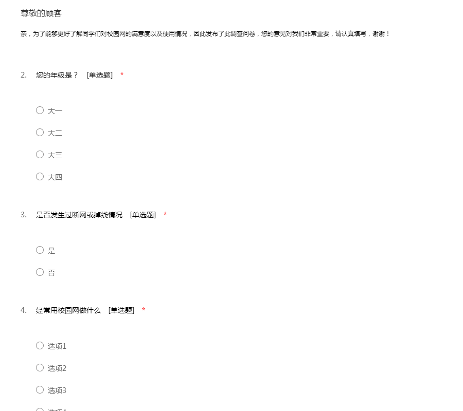 亲,为了能够更好了解同学们对校园网的满意度以及使用情况,因此发布了此调查问卷,您的意见对我们非常重要,请认真填写,谢谢!