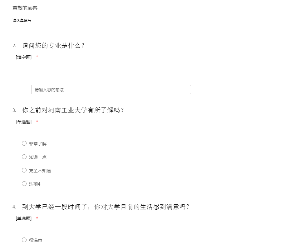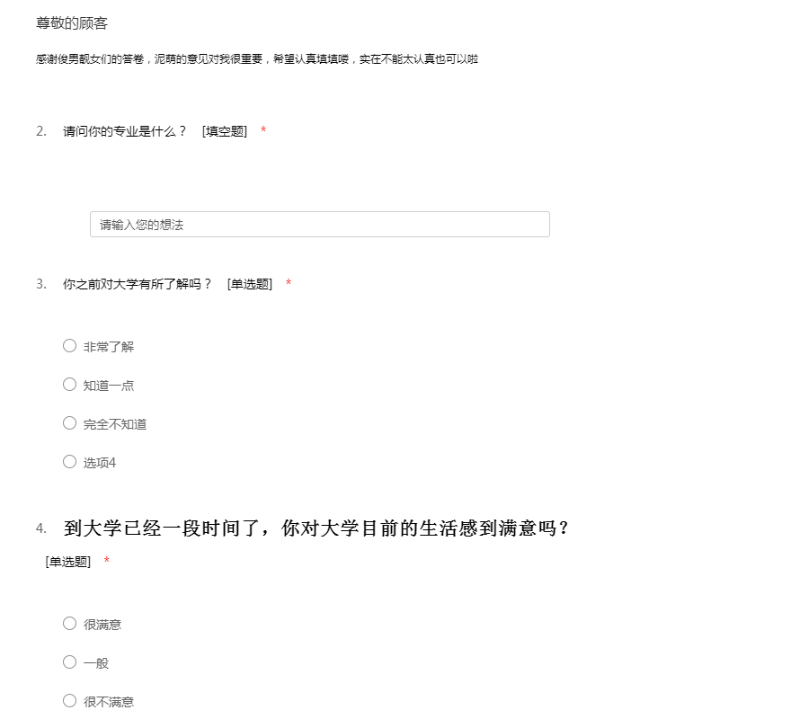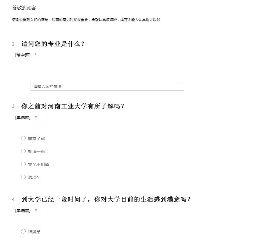 为了调查学校学生对学校生活满意度的情况,想邀请您用几分钟时间帮忙填答这份问卷。本问卷实行匿名制,我要调查网感谢您参与!