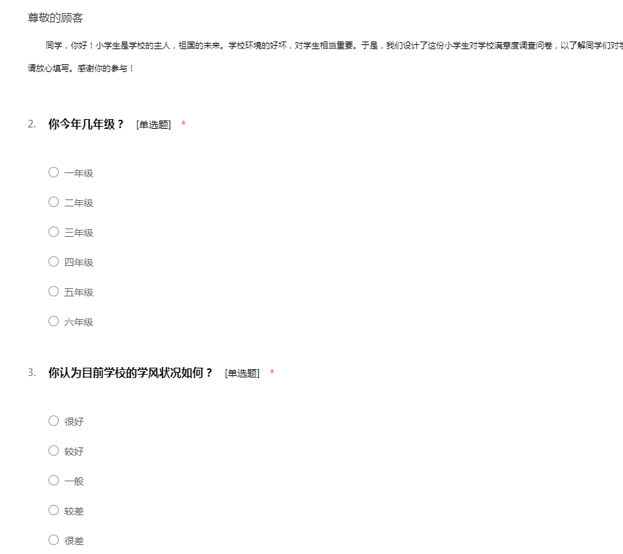 ——同学,你好!小学生是学校的主人,祖国的未来。学校环境的好坏,对学生相当重要。于是,我们设计了这份小学生对学校满意度调查问卷,以了解同学们对学校的满意程度。本问卷采取不记名的方式,所以请放心填写。感谢你的参与!