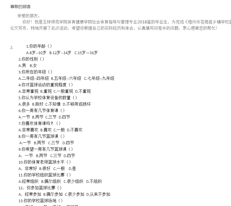 亲爱的朋友: 你好!我是玉林师范学院体育健康学院社会体育指导与管理专业2018届的毕业生,为完成《梧州市苍梧县乡镇学校篮球的发展现状与对策研究》的毕业论文写作,特地开展了此次活动,希望你根据自己的实际经历和体会,认真填写问卷中的问题,衷心感谢您的帮忙!