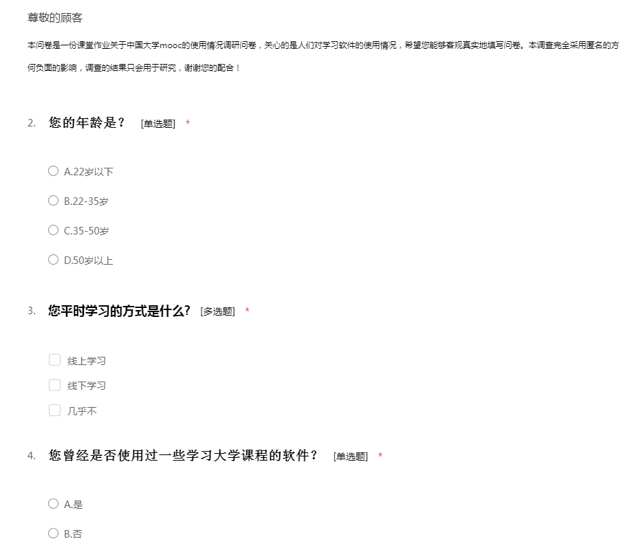 本问卷是一份课堂作业关于中国大学mooc的使用情况调研问卷,关心的是人们对学习软件的使用情况,希望您能够客观真实地填写问卷。本调查完全采用匿名的方式进行,我们保证不会对您的工作和生活带来任何负面的影响,调查的结果只会用于研究,谢谢您的配合!