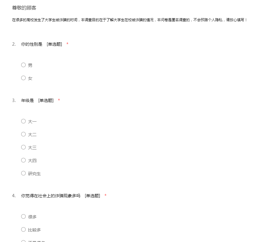 在很多的高校发生了大学生被诈骗的时间,本调查目的在于了解大学生在校被诈骗的情况,本问卷是匿名调查的,不会邪路个人隐私,请放心填写!