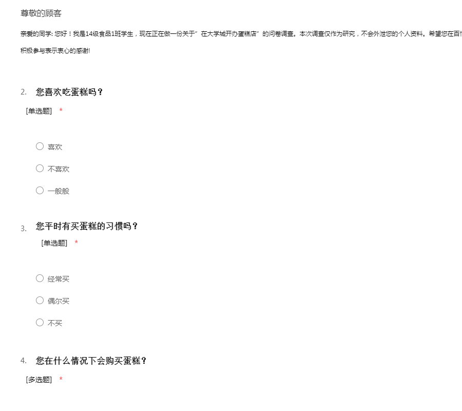 亲爱的同学: 您好!我是14级食品1班学生,现在正在做一份关于”在大学城开办蛋糕店”的问卷调查。本次调查仅作为研究,不会外泄您的个人资料。希望您在百忙之中抽空真实填写这份问卷。再此我们向您的积极参与表示衷心的感谢!