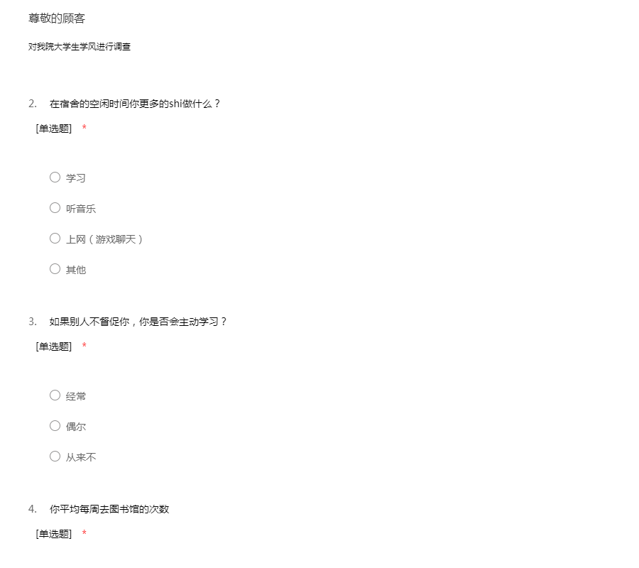 亲爱的同学:您好!我是安徽商贸职业技术学院一名大二的学生,为了了解关于大学生在校期间看书的习惯和对图书馆的满意程度,更好的为您服务,特地设计了此调查问卷,问卷中涉及的私人问题,我们会为您保密,感谢您抽空填写问卷!