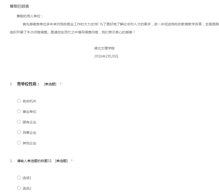 尊敬的用人单位: 首先感谢贵单位多年来对我校就业工作的大力支持! 为了更好地了解社会对人才的需求,进一步促进我校的教育教学改革,全面提高学生素质,更好地为用人单位服务,我们组织开展了本次问卷调查。恳请您在百忙之中填写调查问卷,我们表示衷心的感谢! 湖北文理学院 2016年2月20日