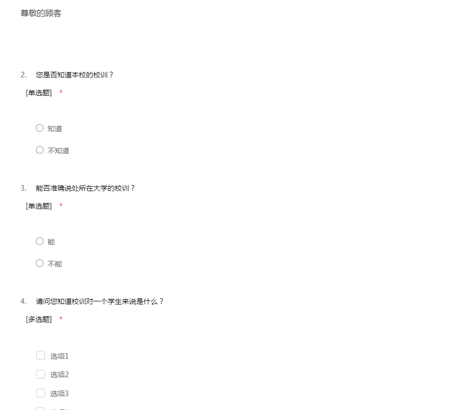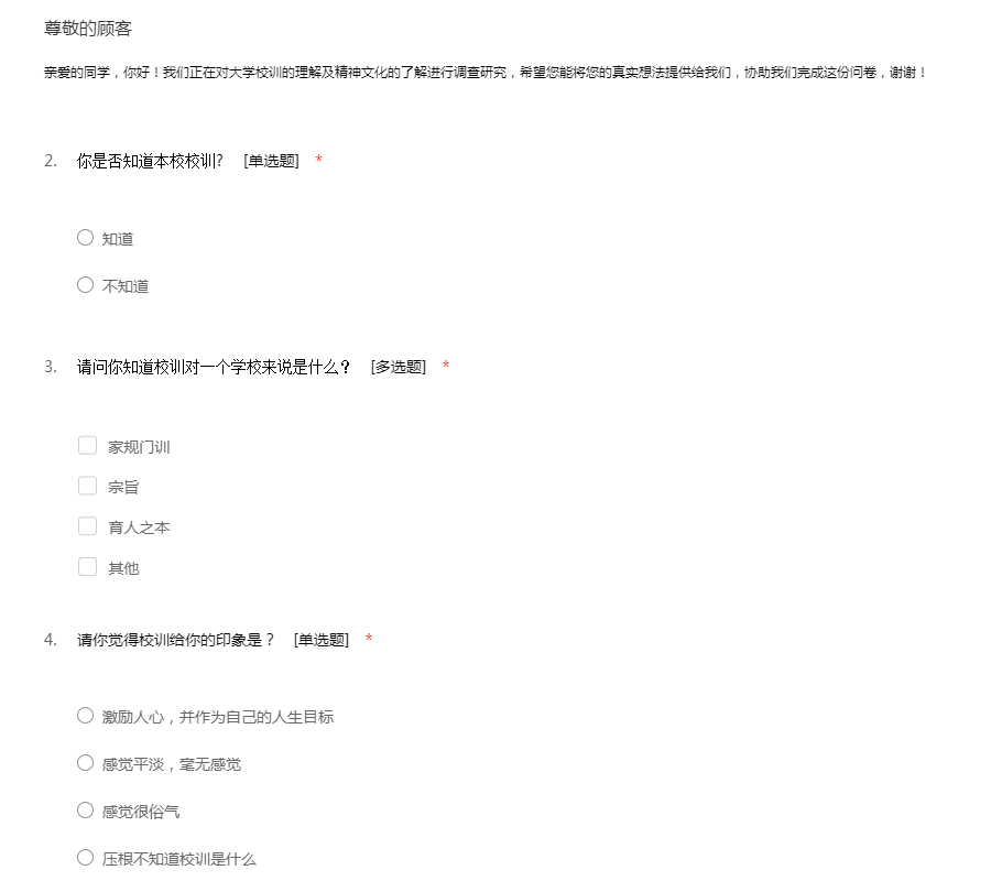 亲爱的同学,你好!我们正在对大学校训的理解及精神文化的了解进行调查研究,希望您能将您的真实想法提供给我们,协助我们完成这份问卷,谢谢!