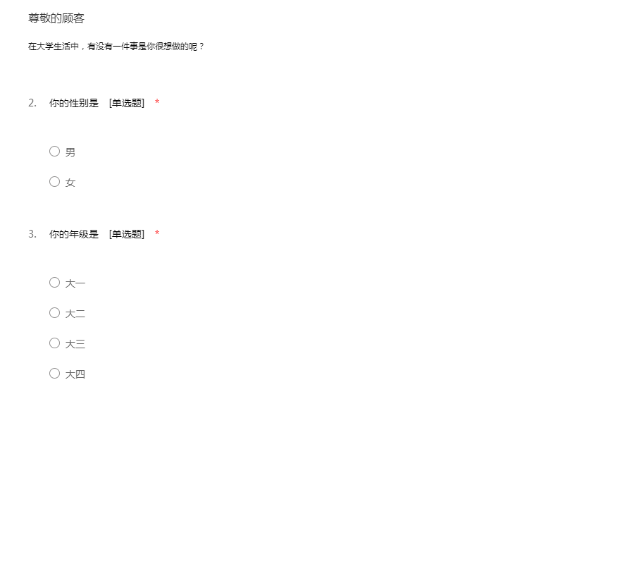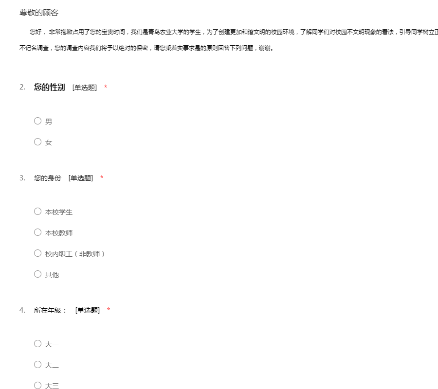 您好, 非常抱歉占用了您的宝贵时间,我们是青岛农业大学的学生,为了创建更加和谐文明的校园环境,了解同学们对校园不文明现象的看法,引导同学树立正确的文明意识,特此做此调查。此次调查,实行不记名调查,您的调查内容我们将予以绝对的保密,请您秉着实事求是的原则回答下列问题,谢谢。