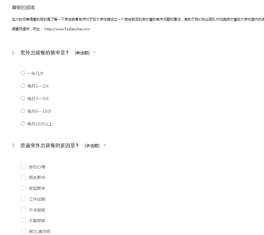 这次的问卷调查的目的是了解一下学生或者老师对于在大学校园设立一个自给自足的自炊屋的有关问题和看法,有助于我们创业团队对校园自炊屋在大学校园内的实践和发展。餐饮问卷调查模板是我要调查网提供,网址: http://www.51diaocha.com