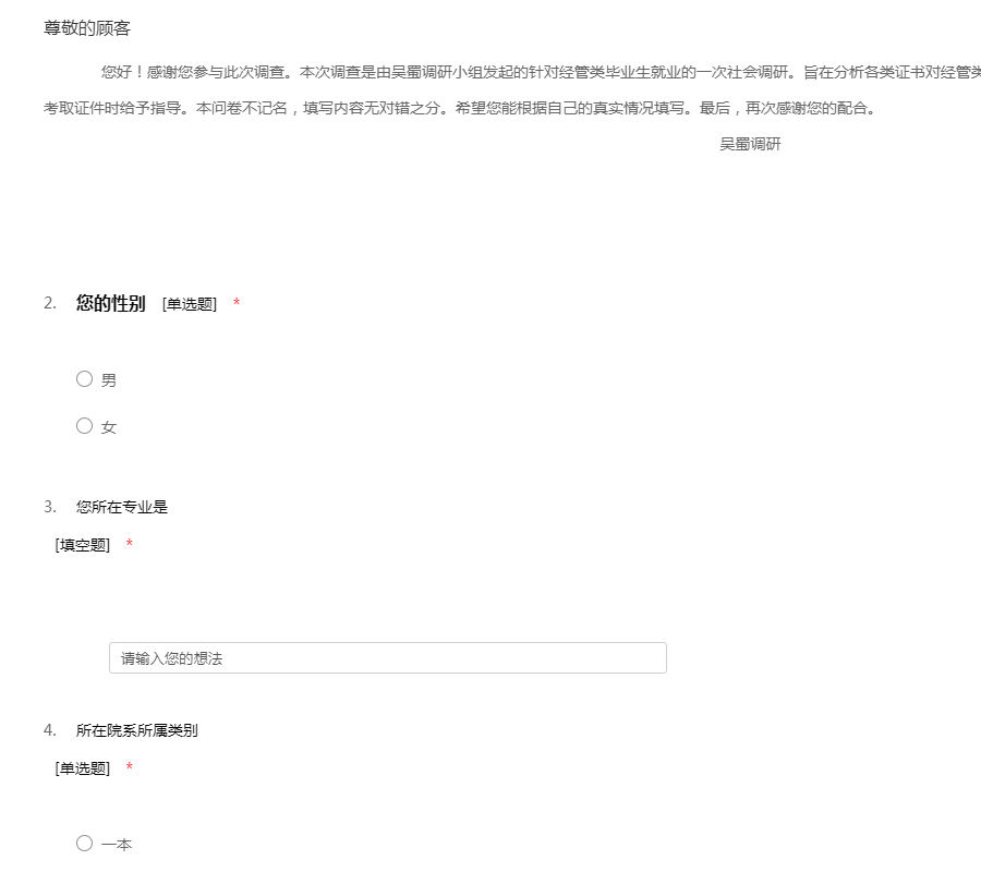 您好!感谢您参与此次调查。本次调查是由吴蜀调研小组发起的针对经管类毕业生就业的一次社会调研。旨在分析各类证书对经管类毕业生毕业及就业的影响。为学弟学妹在考取证件时给予指导。本问卷不记名,填写内容无对错之分。希望您能根据自己的真实情况填写。最后,再次感谢您的配合。 吴蜀调研