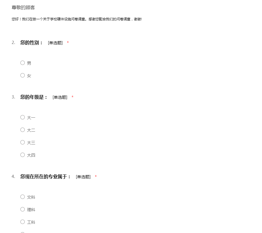 您好!我们在做一个关于学校硬件设施问卷调查。感谢您配合我们的问卷调查,谢谢!