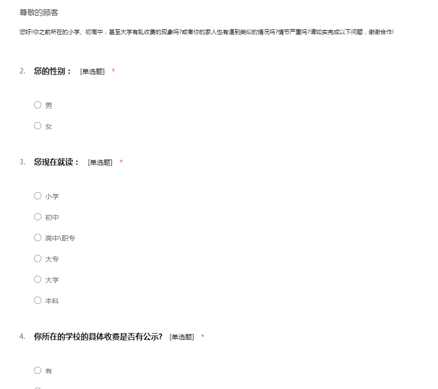 您好!你之前所在的小学、初高中,甚至大学有乱收费的现象吗?或者你的家人也有遇到类似的情况吗?情节严重吗?请如实完成以下问题,谢谢合作!