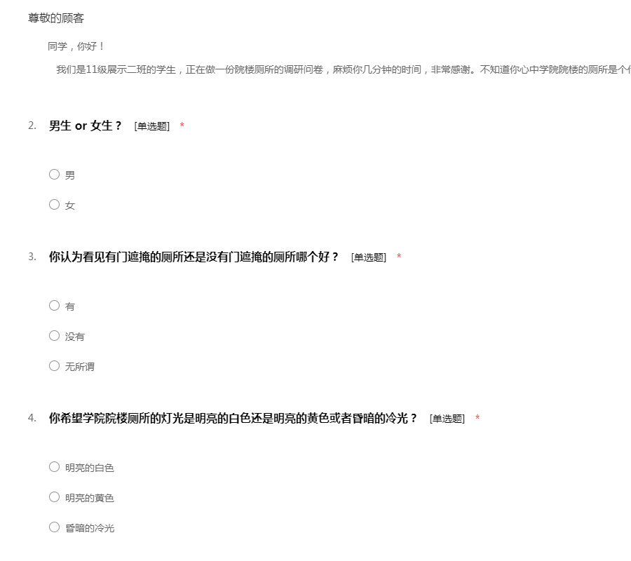 同学,你好! 我们是11级展示二班的学生,正在做一份院楼厕所的调研问卷,麻烦你几分钟的时间,非常感谢。不知道你心中学院院楼的厕所是个什么样子?