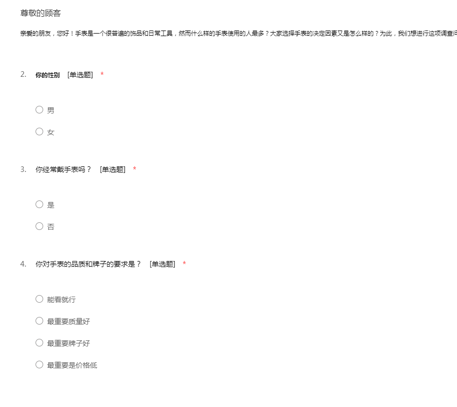 亲爱的朋友,您好!手表是一个很普遍的饰品和日常工具,然而什么样的手表使用的人最多?大家选择手表的决定因素又是怎么样的?为此,我们想进行这项调查问卷,需要您的支持。在此,我们深表感谢!