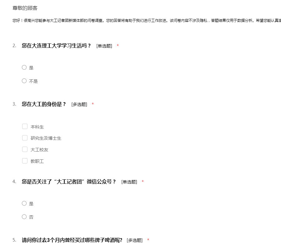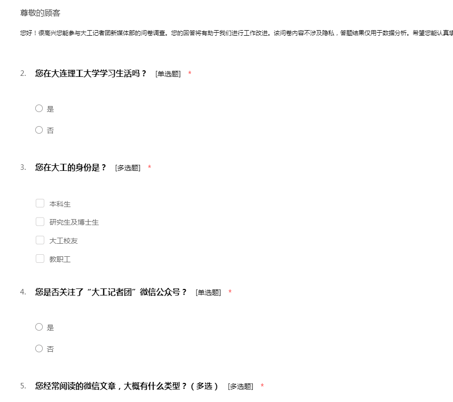 您好!很高兴您能参与大工记者团新媒体部的问卷调查。您的回答将有助于我们进行工作改进。该问卷内容不涉及隐私,答题结果仅用于数据分析。希望您能认真填写。感谢您的配合,祝您生活愉快!