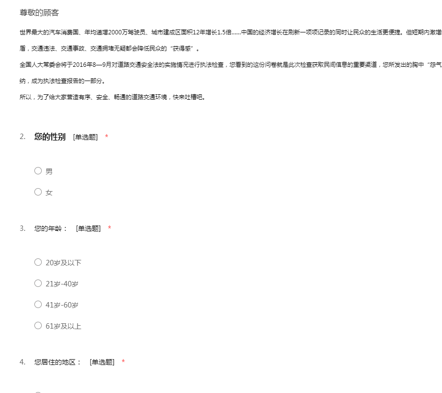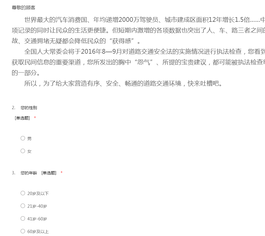 世界最大的汽车消费国、年均递增2000万驾驶员、城市建成区面积12年增长1.5倍……中国的经济增长在刷新一项项记录的同时让民众的生活更便捷。但短期内激增的各项数据也突出了人、车、路三者之间的矛盾,交通违法、交通事故、交通拥堵无疑都会降低民众的“获得感”。全国人大常委会将于2016年8—9月对道路交通安全法的实施情况进行执法检查,您看到的这份问卷就是此次检查获取民间信息的重要渠道,您所发出的胸中“怨气”、所提的宝贵建议,都可能被执法检查组采纳,成为执法检查报告的一部分。所以,为了给大家营造有序、安全、畅通的道路交通环境,快来吐槽吧。