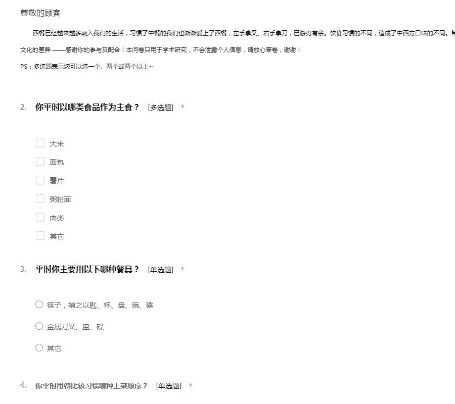 西餐已经越来越多融入我们的生活,习惯了中餐的我们也渐渐爱上了西餐,左手拿叉、右手拿刀,已游刃有余。饮食习惯的不同,造成了中西方口味的不同。希望你在做这份问卷的同时能更多的了解中西饮食文化的差异 ——感谢你的参与及配合!本问卷只用于学术研究,不会泄露个人信息,请放心答卷,谢谢!PS:多选题表示您可以选一个、两个或两个以上~