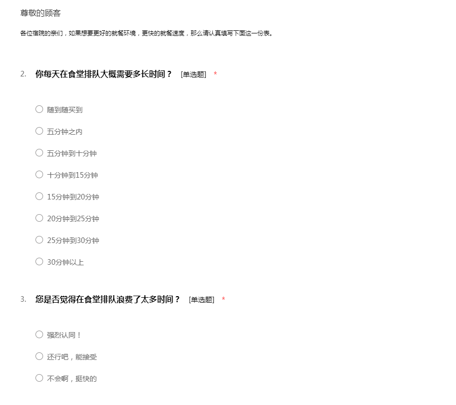 为了提高食堂的饭菜质量,实现食堂规范化管理,特开展本次问卷调查。请各位伙伴根据自身在食堂的用餐的真是感受进行填写,以帮助我们进行改进。