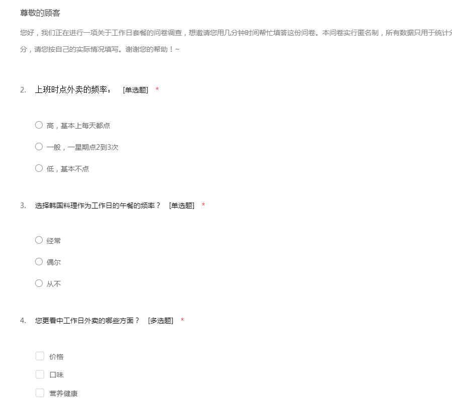 您好,我们正在进行一项关于工作日套餐的问卷调查,想邀请您用几分钟时间帮忙填答这份问卷。本问卷实行匿名制,所有数据只用于统计分析, 请您放心填写。题目选项无对错之分,请您按自己的实际情况填写。谢谢您的帮助!~