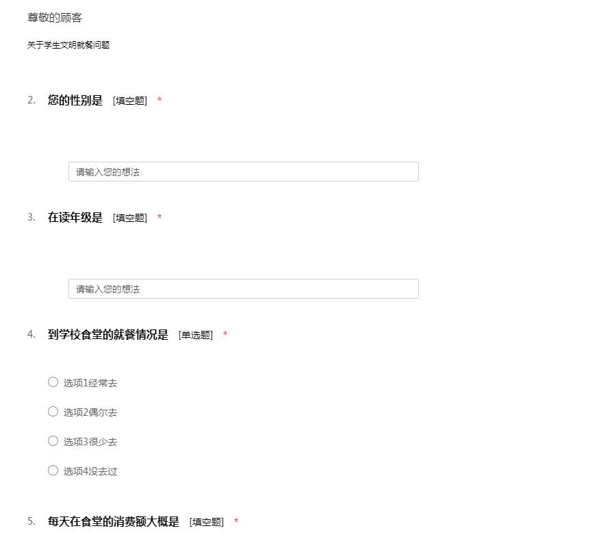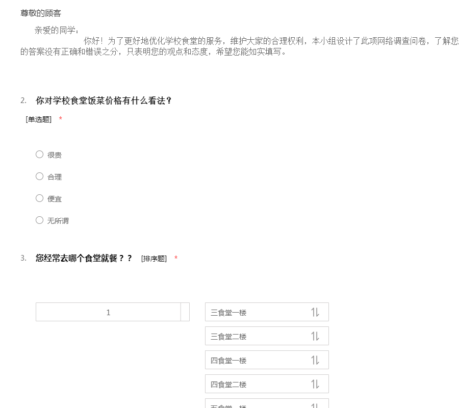 亲爱的同学: 你好!为了更好地优化学校食堂的服务,维护大家的合理权利,本小组设计了此项网络调查问卷,了解您对学校食堂的意见和建议。这些问题的答案没有正确和错误之分,只表明您的观点和态度,希望您能如实填写。