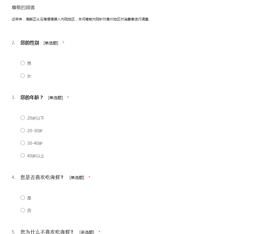 近年来,海鲜正从沿海慢慢袭入内陆地区,本问卷就内陆针对贵州地区对消费者进行调查.