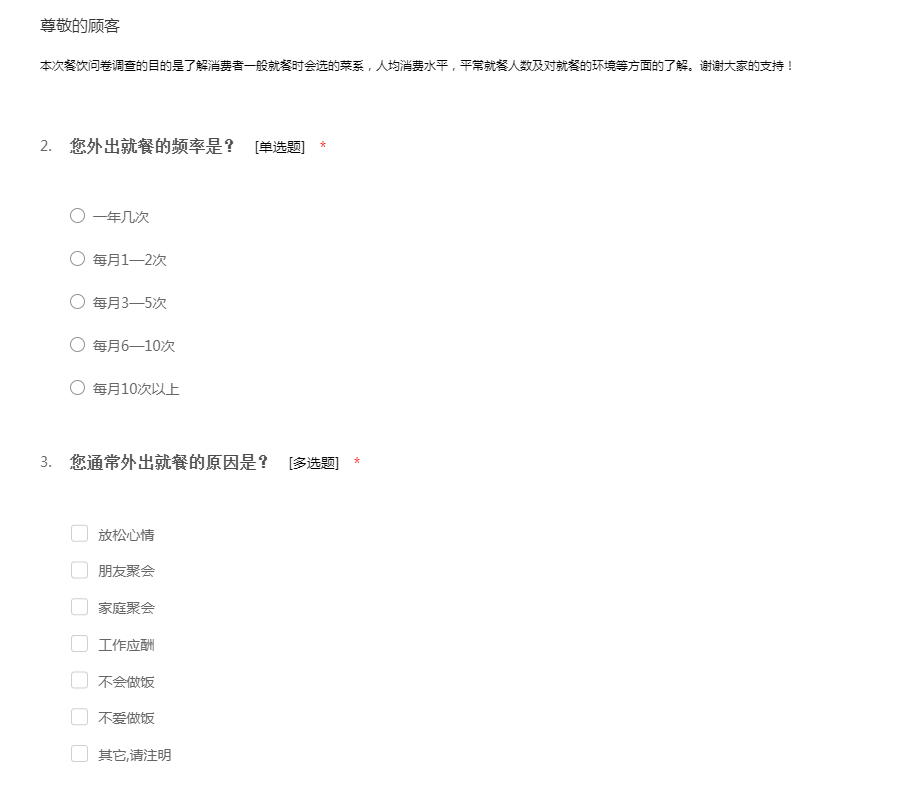 本次餐饮问卷调查的目的是了解一下消费者一般就餐时会选的菜系,人均消费水平,平常就餐人数及对就餐的环境等方面的了解。餐饮问卷调查模板是我要调查网提供,网址: http://www.51diaocha.com