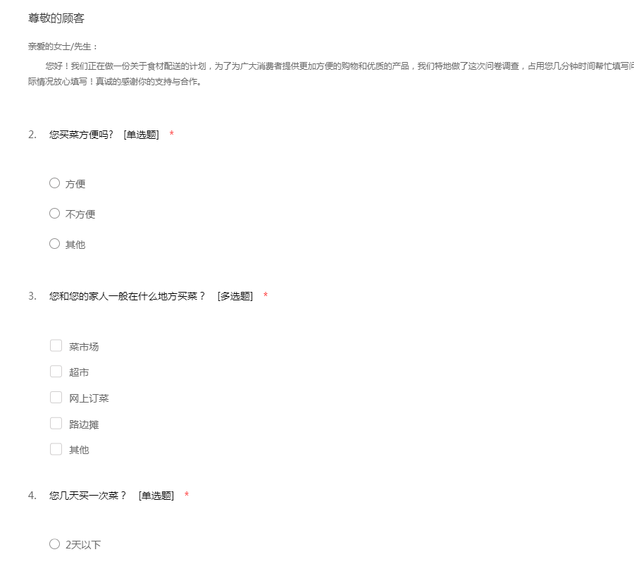 亲爱的女士/先生: 您好!我们正在做一份关于食材配送的计划,为了为广大消费者提供更加方便的购物和优质的产品,我们特地做了这次问卷调查,占用您几分钟时间帮忙填写问卷。本次调查采取匿名调查,请你根据自己的实际情况放心填写!真诚的感谢你的支持与合作。