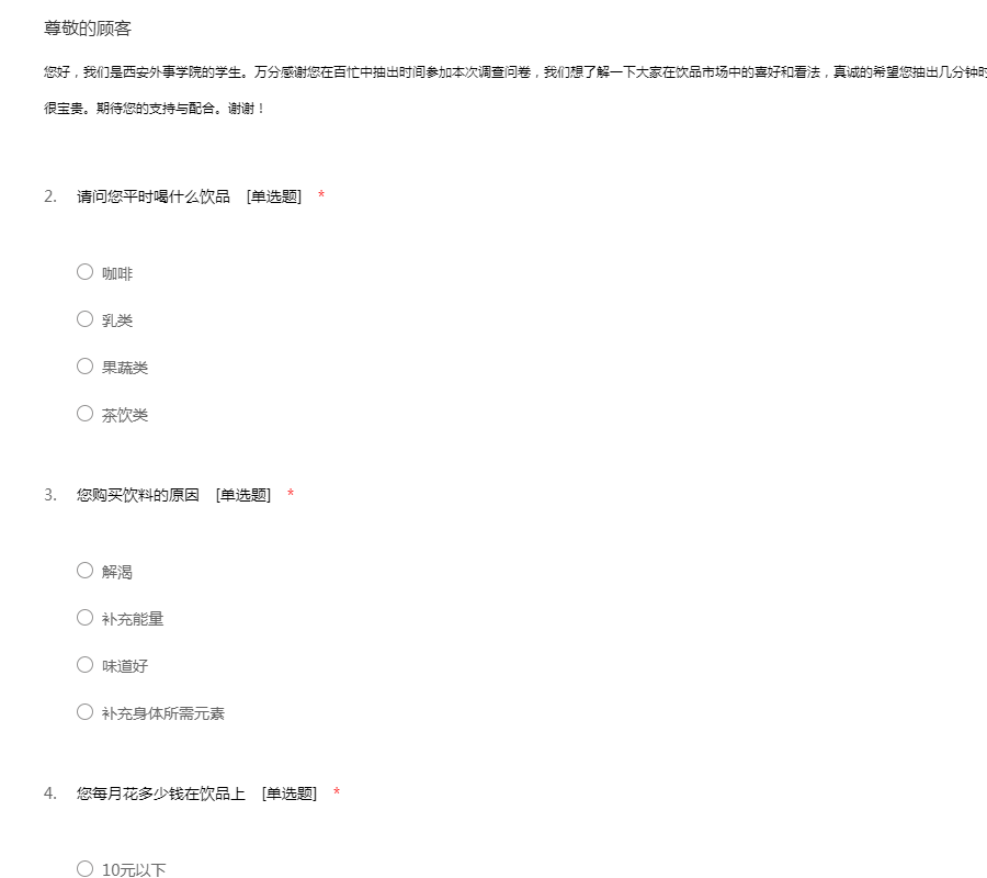 您好,我们是西安外事学院的学生。万分感谢您在百忙中抽出时间参加本次调查问卷,我们想了解一下大家在饮品市场中的喜好和看法,真诚的希望您抽出几分钟时间认真填写下这份问卷,您的每个意见对我们都很宝贵。期待您的支持与配合。谢谢!