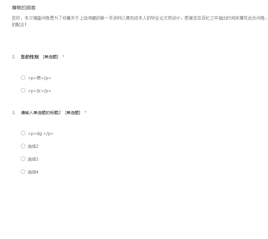 您好,本次调查问卷是为了收集关于上饶鸡腿的第一手资料以便完成本人的毕业论文而设计。感谢您在百忙之中抽出时间来填写此份问卷,您的一切信息不会对外泄露,十分感谢您的配合!
