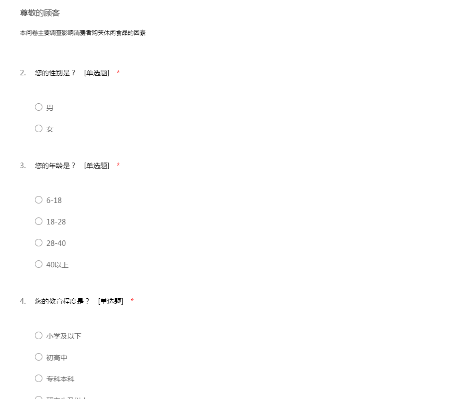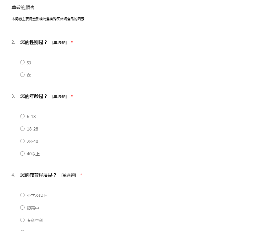 本问卷主要调查影响消费者购买休闲食品的因素