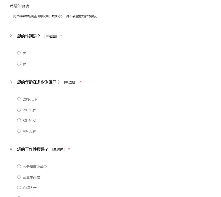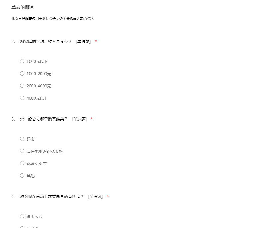 此次蔬菜市场调查问卷仅用于数据分析,纯不会透露大家的隐私。