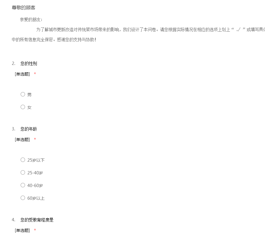 亲爱的朋友: 为了解城市更新改造对传统菜市场带来的影响,我们设计了本问卷。请您根据实际情况在相应的选项上划上“ √ ”或填写具体选项或内容。我们对您所提供的本问卷中的所有信息完全保密。感谢您的支持与协助!