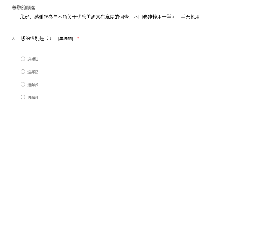 您好,感谢您参与本项关于优乐美奶茶满意度的调查,本问卷纯粹用于学习,并无他用