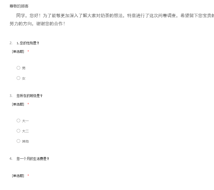 同学,您好!为了能够更加深入了解大家对奶茶的想法,特意进行了这次问卷调查,希望留下您宝贵的意见,您的意见将会成为我们努力的方向,谢谢您的合作!