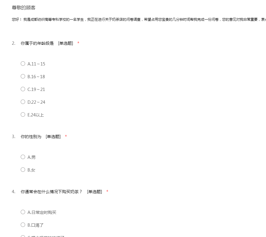 您好! 我是成都纺织高等专科学校的一名学生,我正在进行关于奶茶店的问卷调查,希望占用您宝贵的几分钟时间帮我完成一份问卷,您的意见对我非常重要,衷心希望得到您的支持,谢谢!