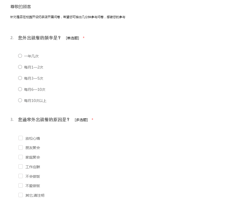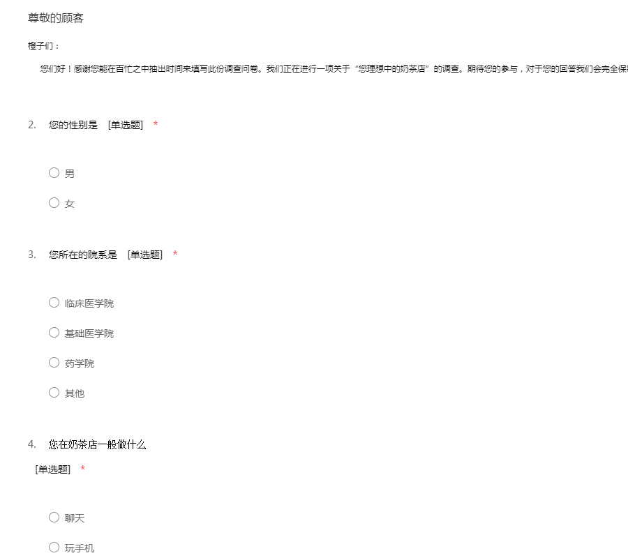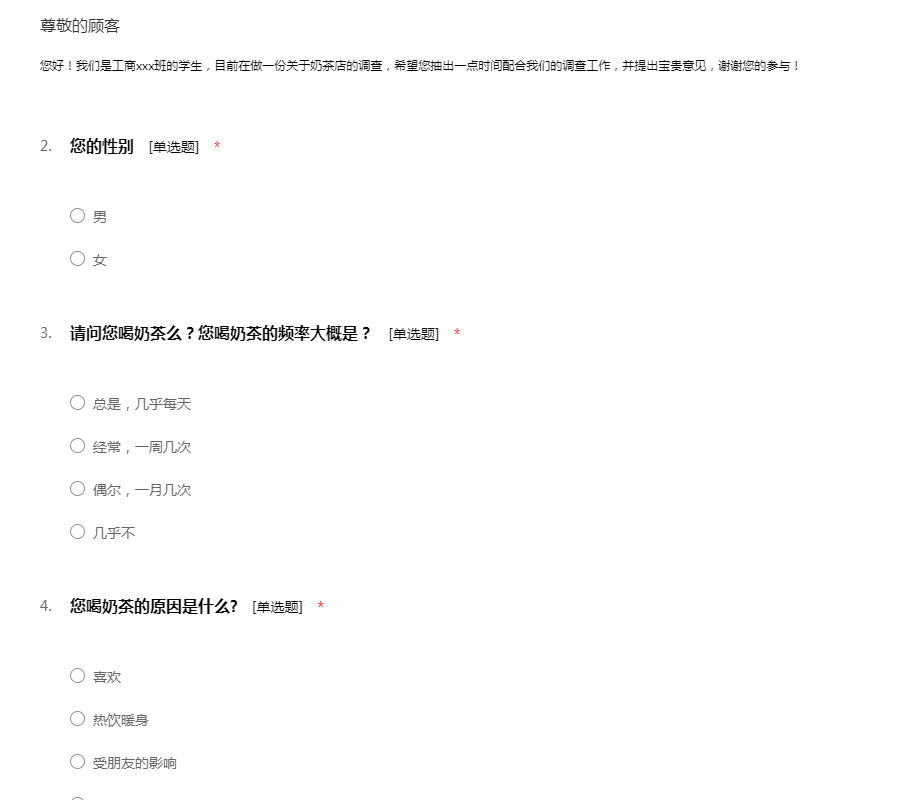 同学,您好!为了能够更加深入了解大家对奶茶的想法,特意进行了这次问卷调查,希望留下您宝贵的意见,您的意见将会成为我们努力的方向,谢谢您的合作!
