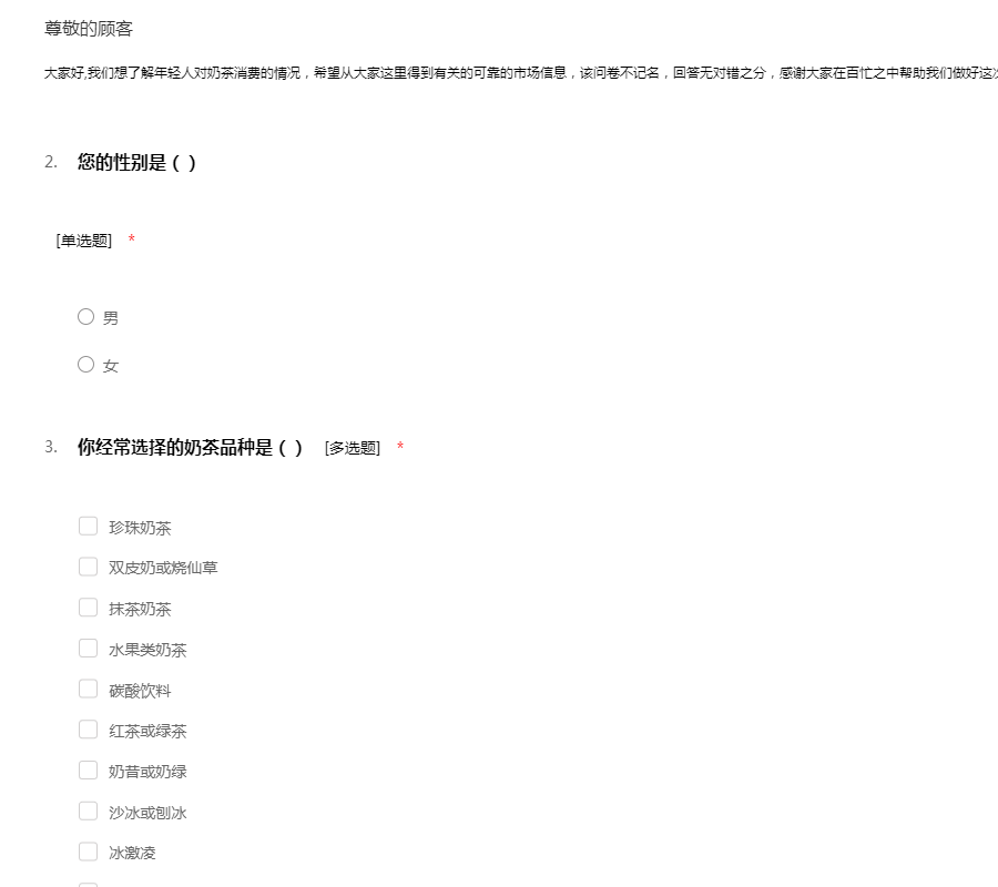 大家好!我是一名大二的学生,现在正在做一份关于奶茶的市场问卷调查实习。此次调查采取不记名方式,不会对您造成任何干扰,请放心作答,谢谢您!
