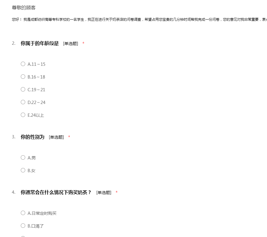 您好! 我是成都纺织高等专科学校的一名学生,我正在进行关于奶茶店的问卷调查,希望占用您宝贵的几分钟时间帮我完成一份问卷,您的意见对我非常重要,衷心希望得到您的支持,谢谢!