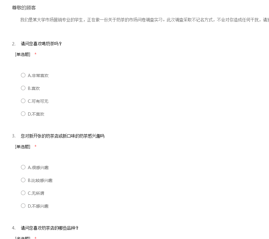 我们是某大学市场营销专业的学生,正在做一份关于奶茶的市场问卷调查实习。此次调查采取不记名方式,不会对你造成任何干扰,请放心作答,谢谢您!