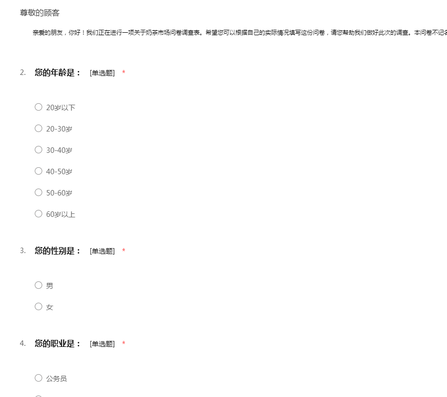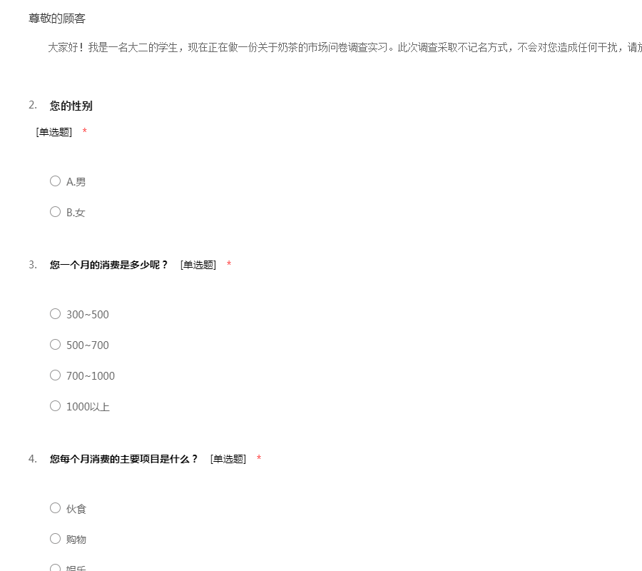 大家好!我是一名大二的学生,现在正在做一份关于奶茶的市场问卷调查实习。此次调查采取不记名方式,不会对您造成任何干扰,请放心作答,谢谢您!