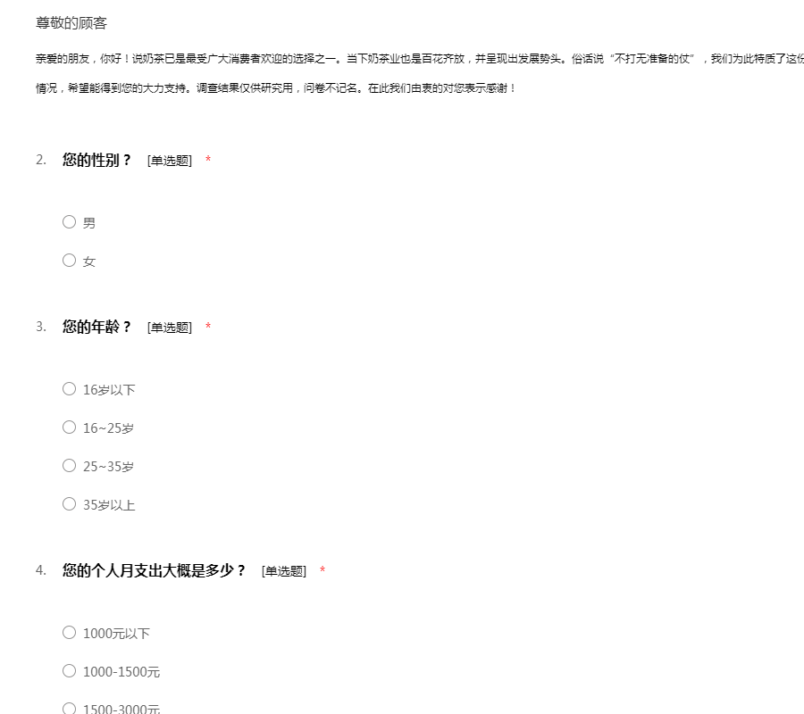 ——亲爱的朋友,你好!我们正在进行一项关于奶茶市场问卷调查表。希望您可以根据自己的实际情况填写这份问卷,请您帮助我们做好此次的调查。本问卷不记名,所以请放心填答。感谢您的支持!