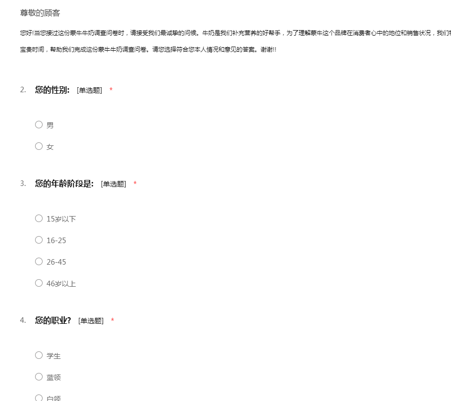 感谢您参与“蒙牛牛奶消费者情况问卷调查”,本次调查目的在于了解消费者对蒙牛牛奶的消费情况,调查所得的结果对您的工作和生活不会带来任何不良影响,请您根据自己的实际情况放心填写,51调查网感谢您的配合!