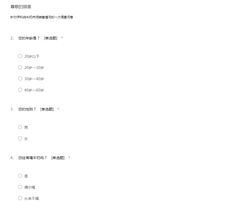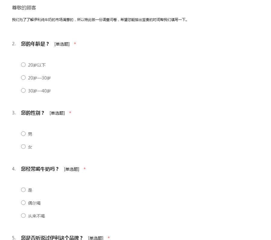 我们为了了解伊利纯牛奶的市场满意的,所以特此做一份调查问卷,希望您能抽出宝贵的时间帮我们填写一下。