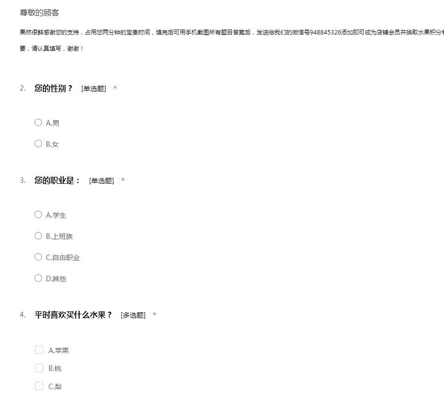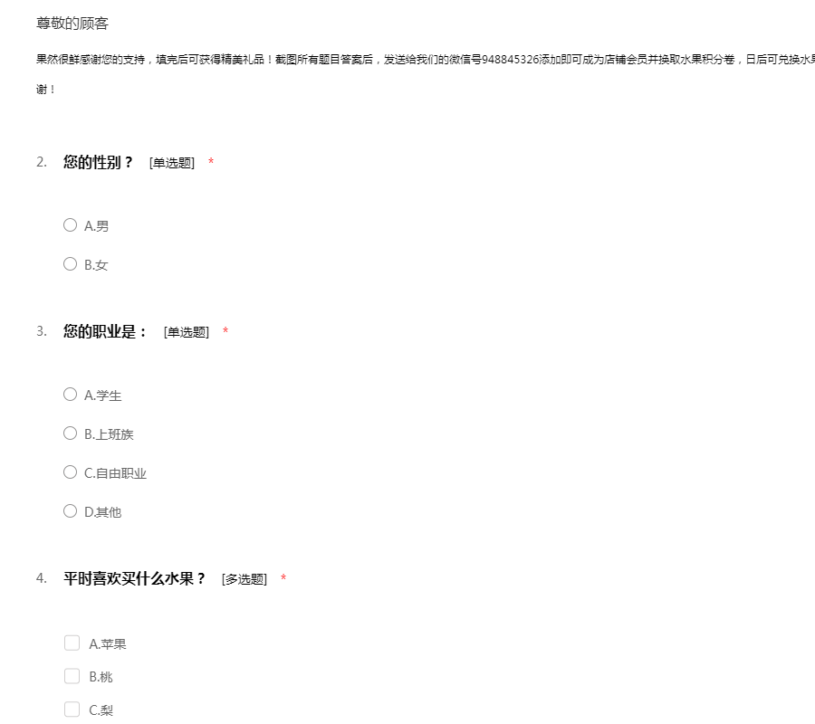 果然很鲜感谢您的支持,填完后可获得精美礼品!截图所有题目答案后,发送给我们的微信号948845326添加即可成为店铺会员并换取水果积分卷,日后可兑换水果!您的意见对我们非常重要,请认真填写,谢谢!