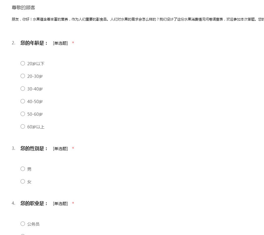 感谢您在百忙之余来填写这份调查问卷。这份调查问卷是为了了解人们目前消费水果的一些情况。同时调查数据是为了为您提供更优质的水果和服务,请您认真填写。且问卷采取不记名方式,不会对您造成任何负面影响,请放心。感谢您给我们提出宝贵的建议!